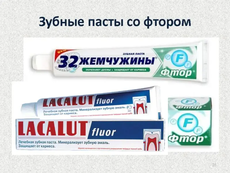 Данное вещество часто добавляют в зубные пасты для профилактики кариеса - монофторфосфат кальция, фтор в английском языке - «флюор». (Слайд 28)