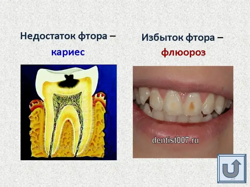 Избыток фтора не менее вреден, так как развивается болезнь флюороз - на зубах появляются темные пятна, впоследствии зубы могут разрушаться. (Слайд 29)