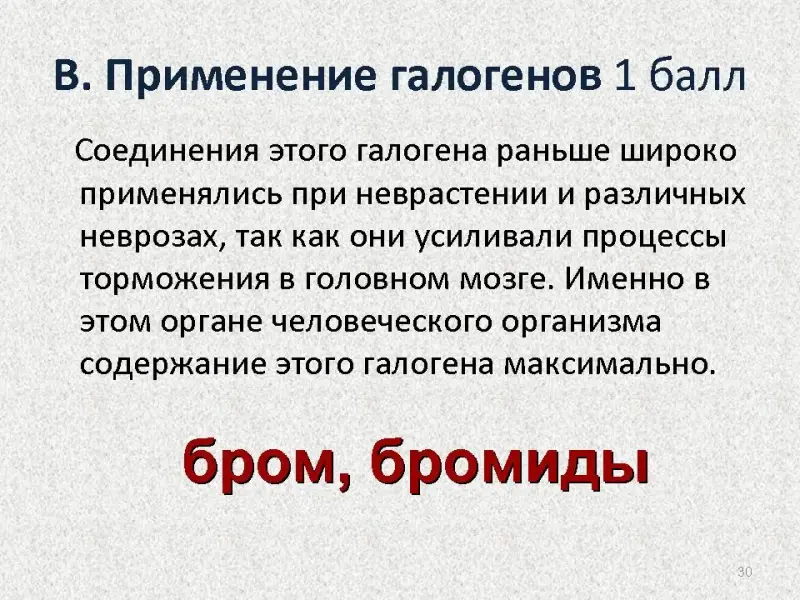 Соединения этого галогена раньше широко применялись при неврастении и различных неврозах, так как они усиливали процессы торможения в головном мозге. Именно в этом органе человеческого организма содержание этого галогена максимально. Назовите галоген и его соединения.