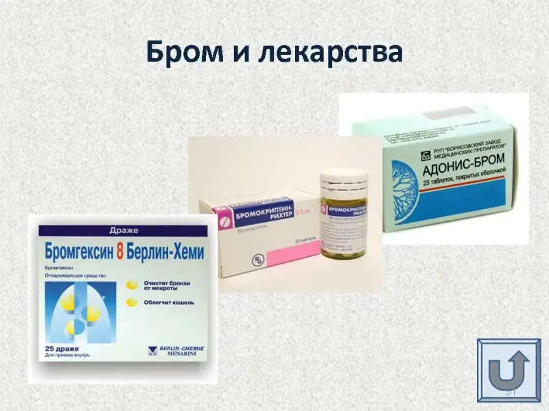 В настоящее время существуют более действенные и менее ядовитые лекарственные препараты. И, тем не менее, бром содержится и в лекарствах, применяемых от кашля и других болезней. (Слайд 31)