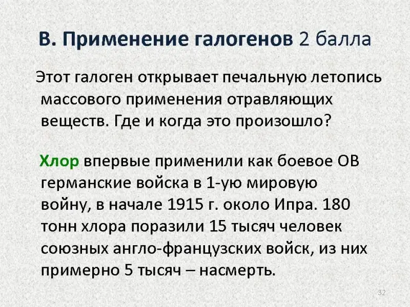 Ответ - галоген - хлор. Его впервые применили как боевое ОВ германские войска в 1-ую мировую войну, в начале 1915 г. около Ипра. (Слайд 33)