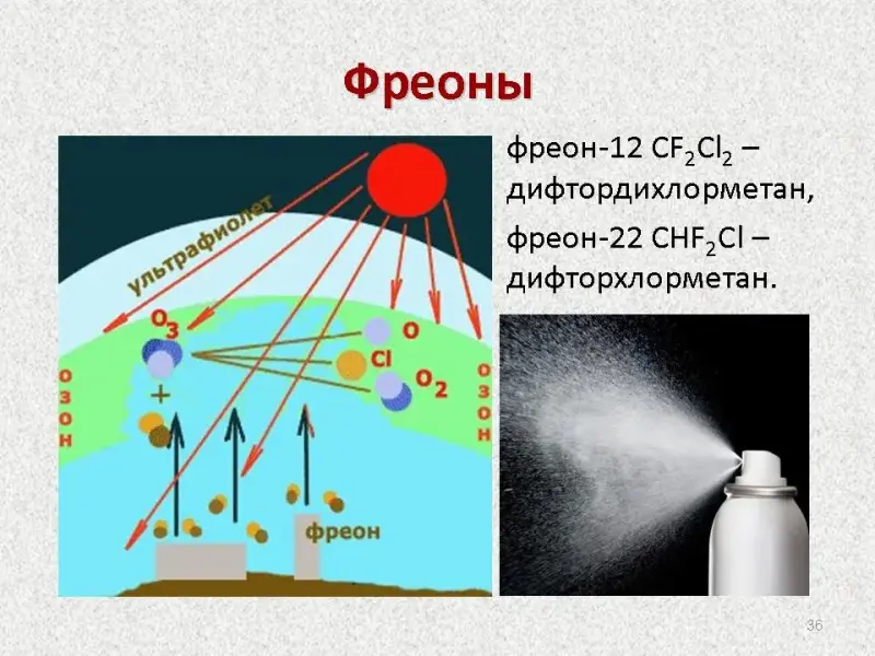 Например, фреон-12 CF2Cl2 - дифтордихлорметан, фреон-22 CHF2Cl - дифторхлорметан. С 1 января 2010 года эти вещества запрещены к ввозу в РФ и использованию. Фреоны разрушают озоновый слой Земли, который защищает нашу Землю от губительного ультрафиолетового излучения Солнца. (Слайды 36, 37)