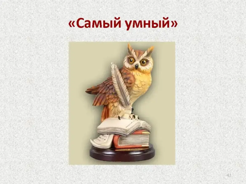 Можно организовать конкурс лучшего игрока «Самый умный» (оценивают зрители и жюри), наградить грамотой и подарком - фигуркой совы. (Слайд 43)