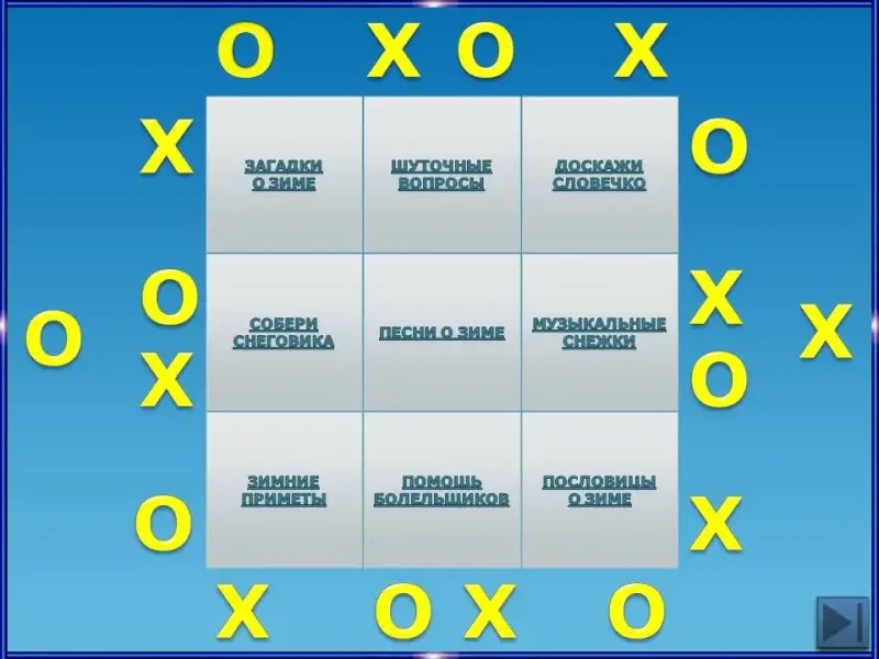 Помещаем знак «Х» или «0» в клетку. (Нажать на нужный знак на экране, он переместится на клетку «Загадки о зиме».) Выигравшая команда выбирает клетку.