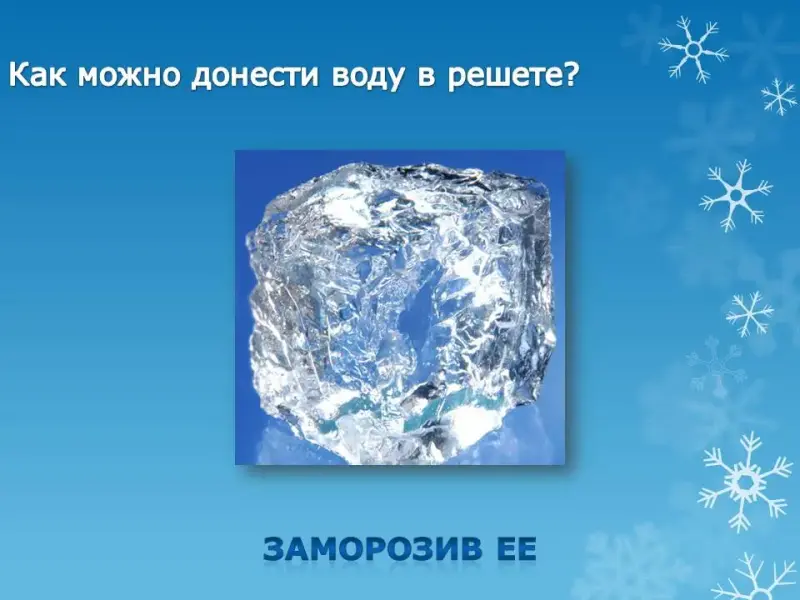 - Как можно донести воду в решете? (Заморозив ее)
