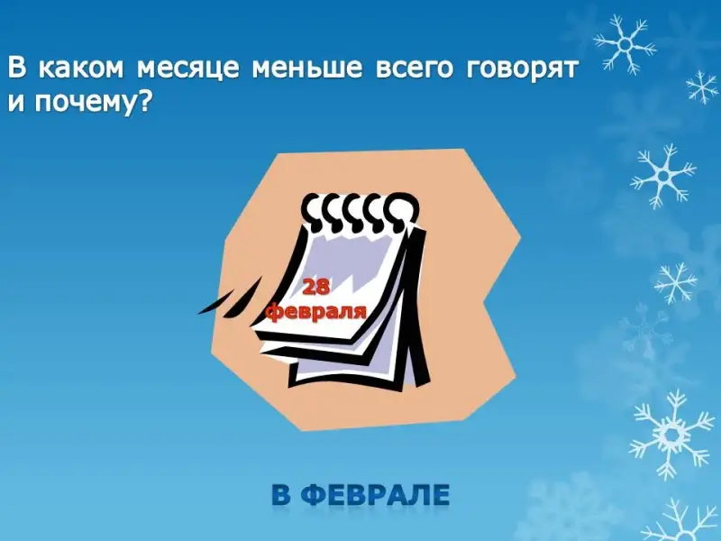 - В каком месяце меньше всего говорят и почему? (В феврале - самый короткий месяц)