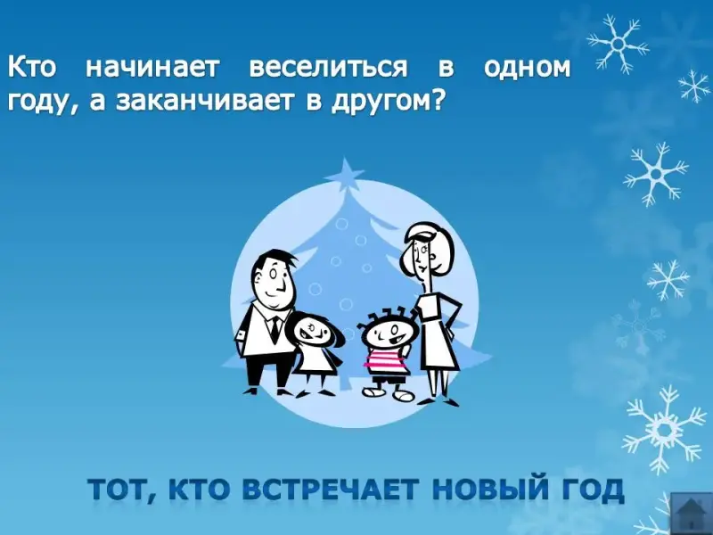 - Кто начинает веселиться в одном году, а заканчивает в другом? (Тот, кто встречает Новый год)