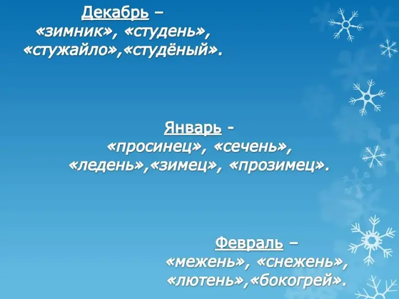 Много зимних примет. Декабрь зовется в народе воротами зимы (слайд 45). Издревле декабрь называли «зимник», «студень», «стужайло», «студеный». В декабре говорили: «Тепло из глаз течет», то есть мороз прошибает до слез.