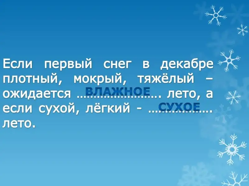 - Если первый снег в декабре плотный, мокрый, тяжелый - ожидается … (влажное) лето, а если сухой, легкий - … (сухое) лето.