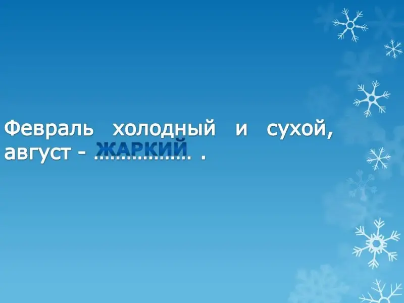 - Февраль холодный и сухой - август … (жаркий).