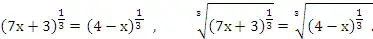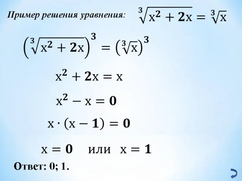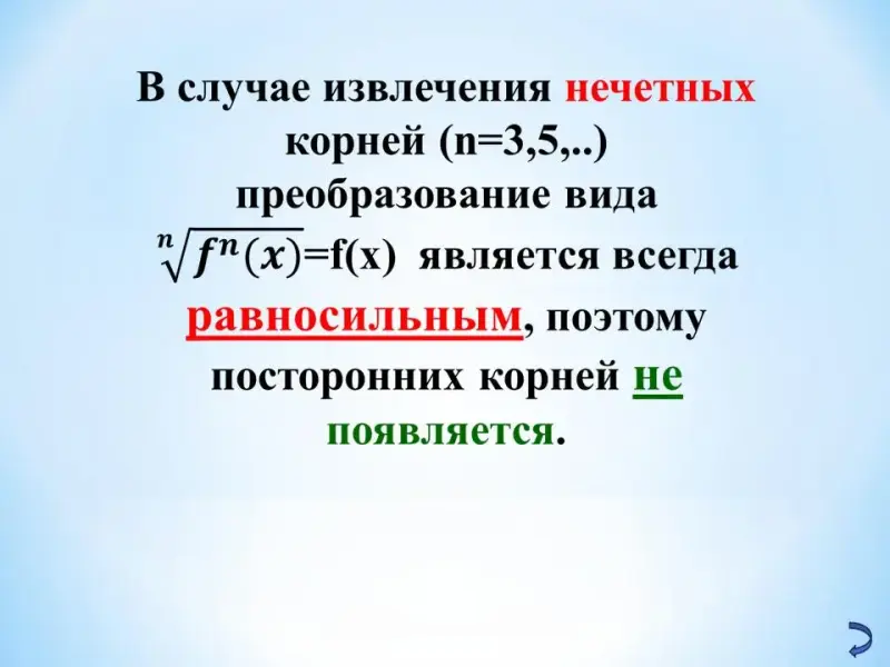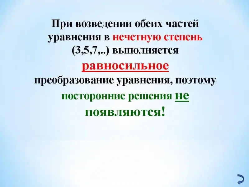 При возведении обеих частей уравнения в нечетную степень (3,5,7…) выполняется равносильное преобразование уравнения, поэтому посторонние решения не появляются. (Слайды 6-7)