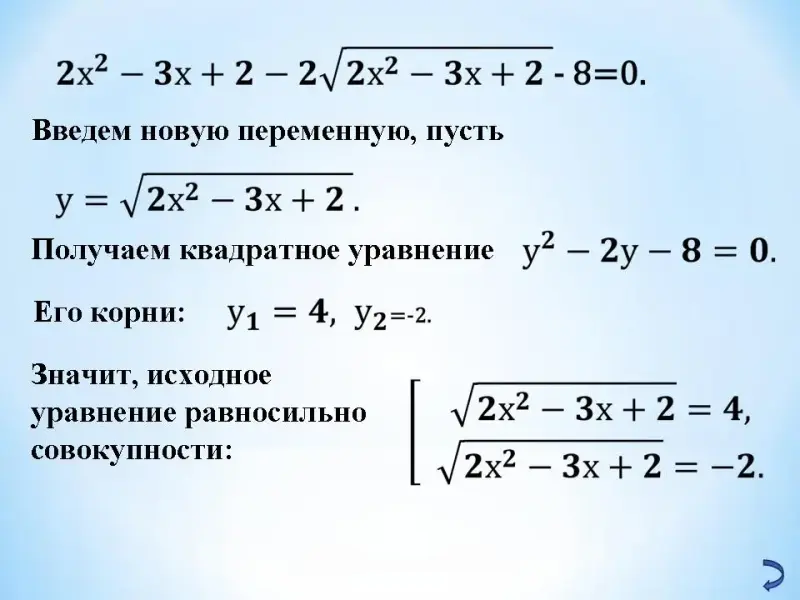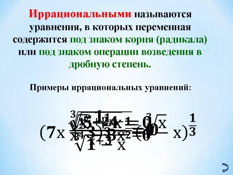 Иррациональным уравнением называются уравнения, в которых переменная содержится под знаком корня (радикала) или под знаком операции возведения в дробную степень.