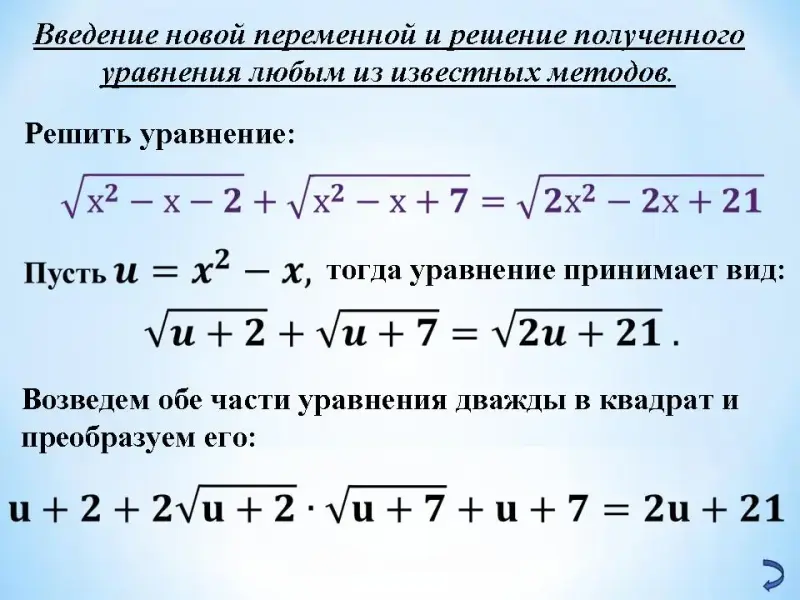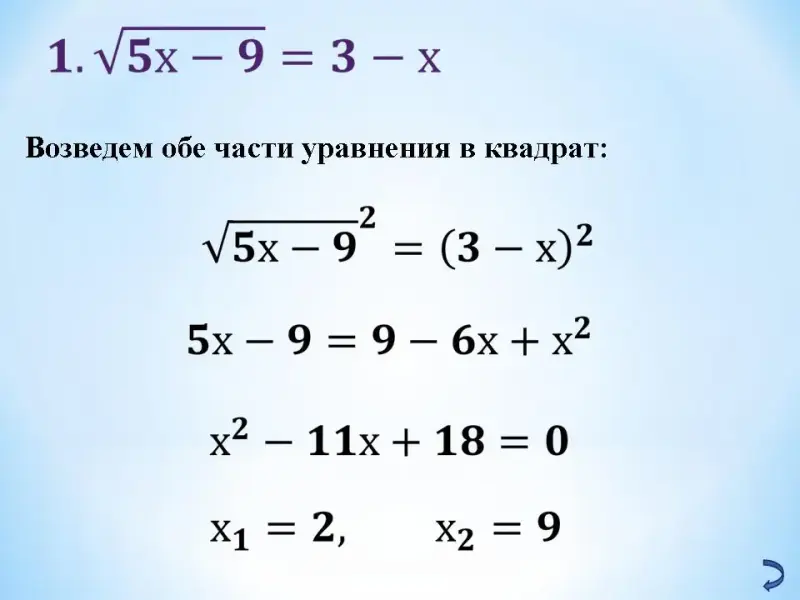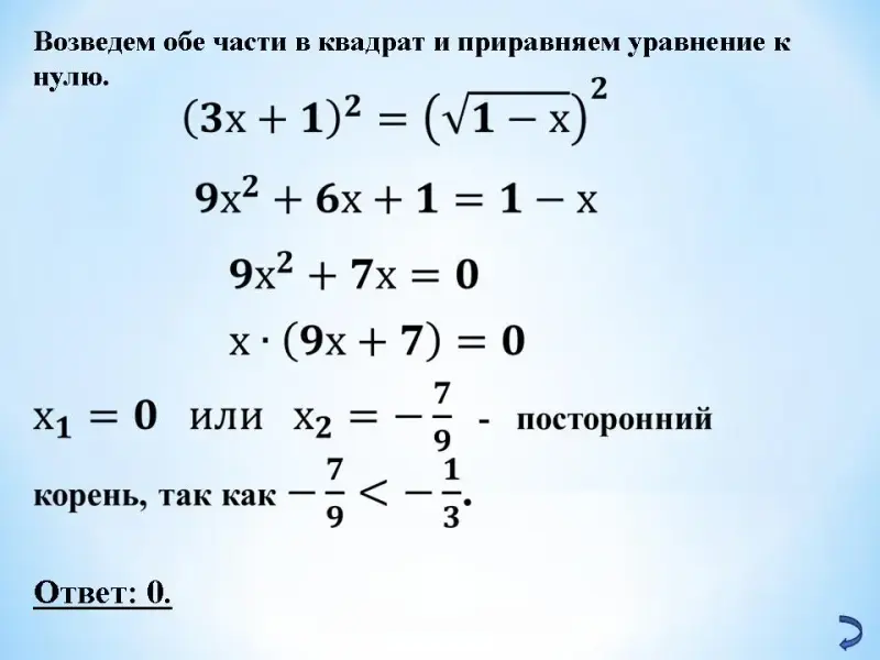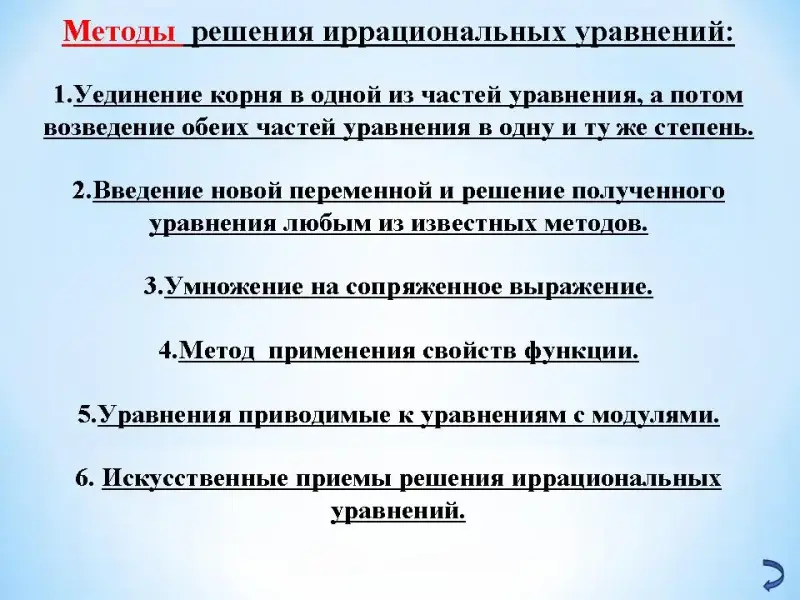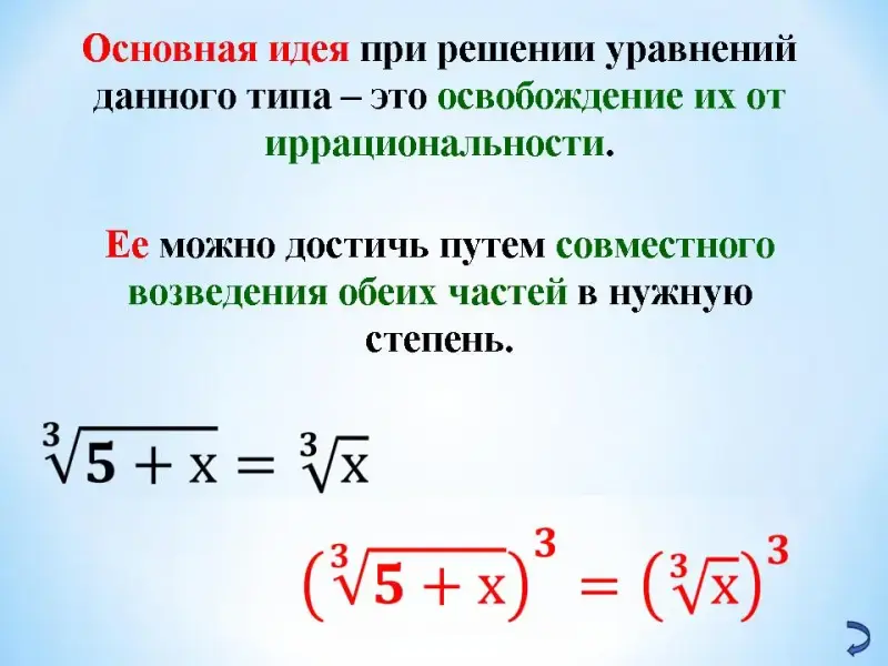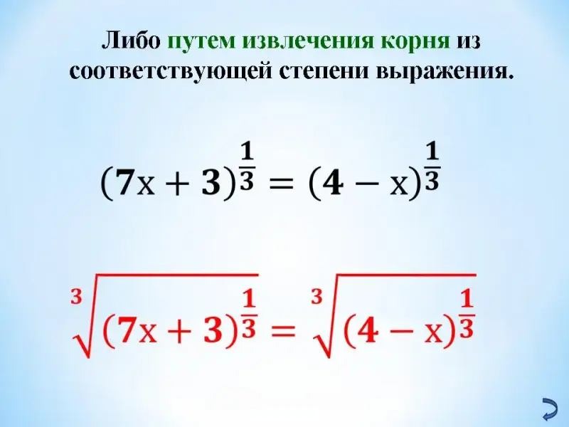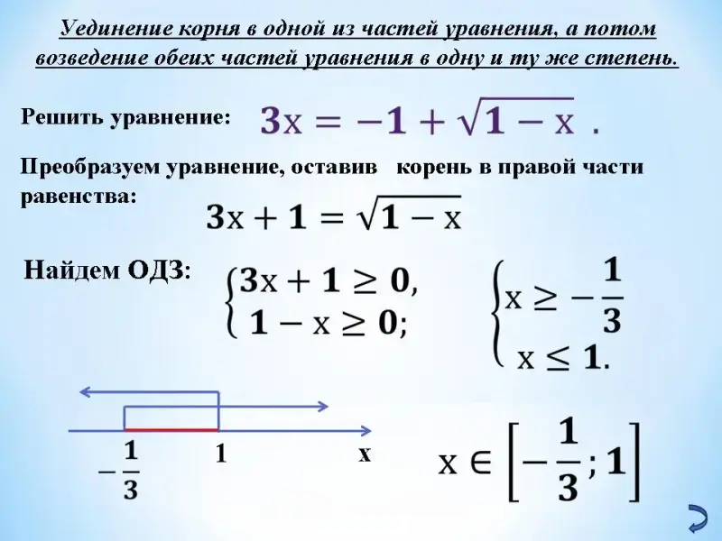 1. Уединение корня в одной из частей уравнения, а потом возведение обеих частей уравнения в одну и ту же степень.