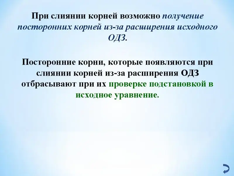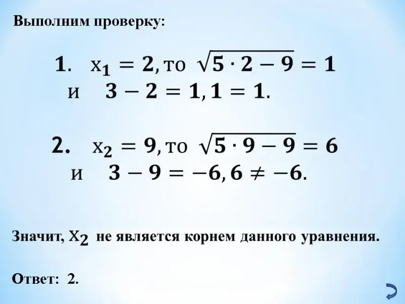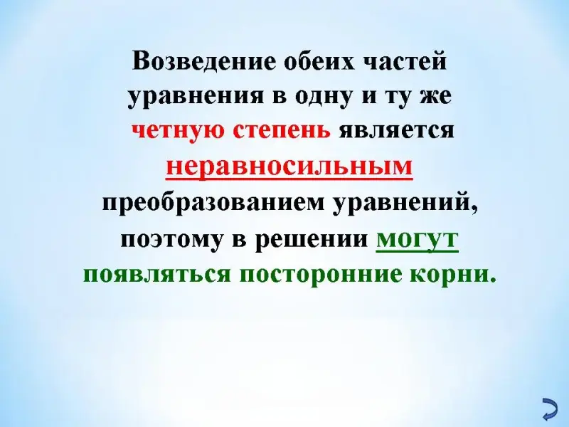 Возведение обеих частей уравнения в одну и ту же четную степень, является неравносильным преобразованием уравнений, поэтому в решении могут появляться посторонние корни. Для отсеивания посторонних корней необходимо выполнять проверку или находить область допустимых значений. (Слайды 8-9)