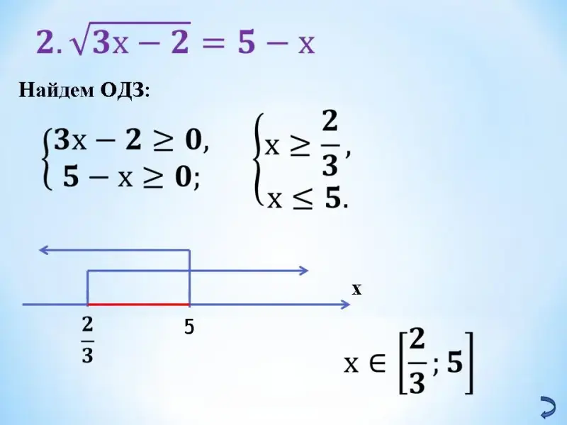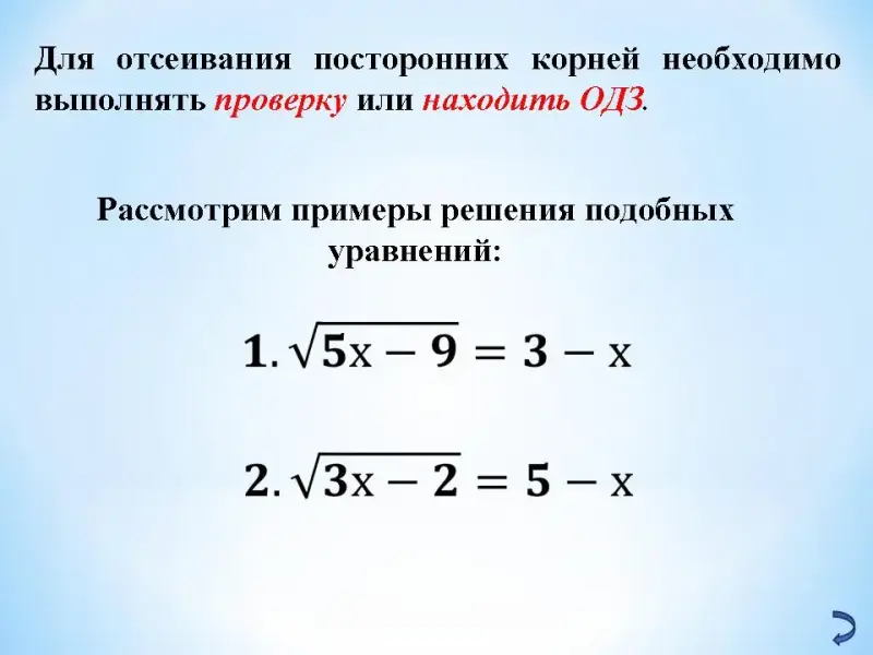 - Найти ОДЗ или после нахождения корней уравнения выполнить проверку.