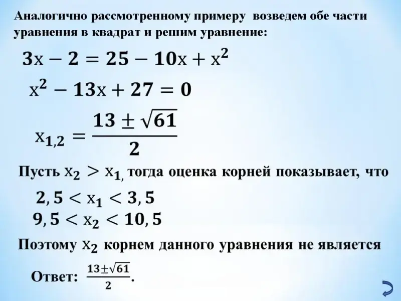 3.4.1. Уединение корня в одной из частей уравнения, а потом возведение обеих частей уравнения в одну и ту же степень. (Слайды 21-22)