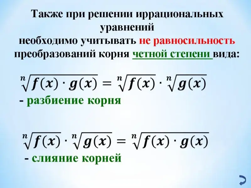 Также при решении иррациональных уравнений необходимо учитывать не равносильность преобразований корня четной степени вида (слайд 16):
