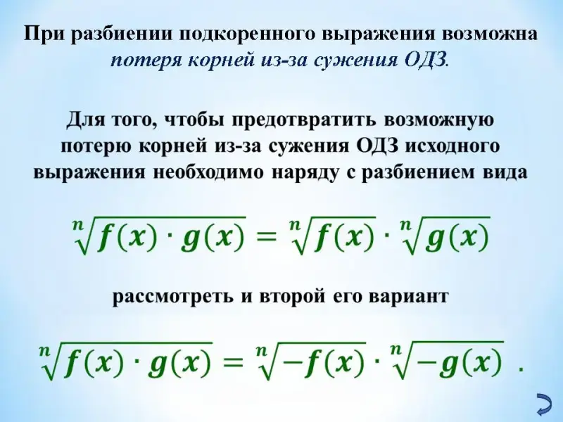 При разбиении подкоренного выражения возможна потеря корней из-за сужения области допустимых значений. При слиянии корней возможно получение посторонних корней из-за расширения исходного ОДЗ. Для
