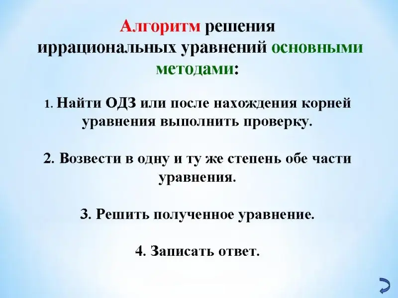 Алгоритм решения иррациональных уравнений основными методами (слайд 19):