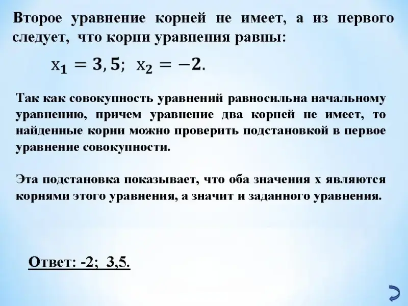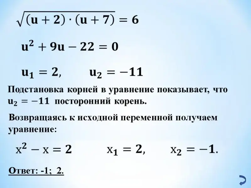 Рассмотрим примеры решения подобных уравнений (слайды 10-13).
