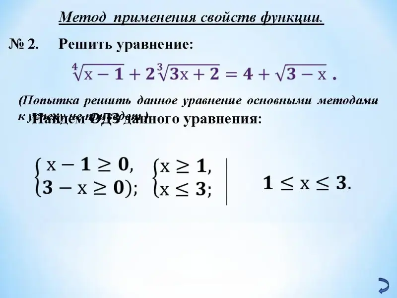 3.4.4. Метод применения свойств функции при нахождении корней уравнения. (Слайд 28-30)