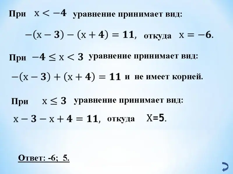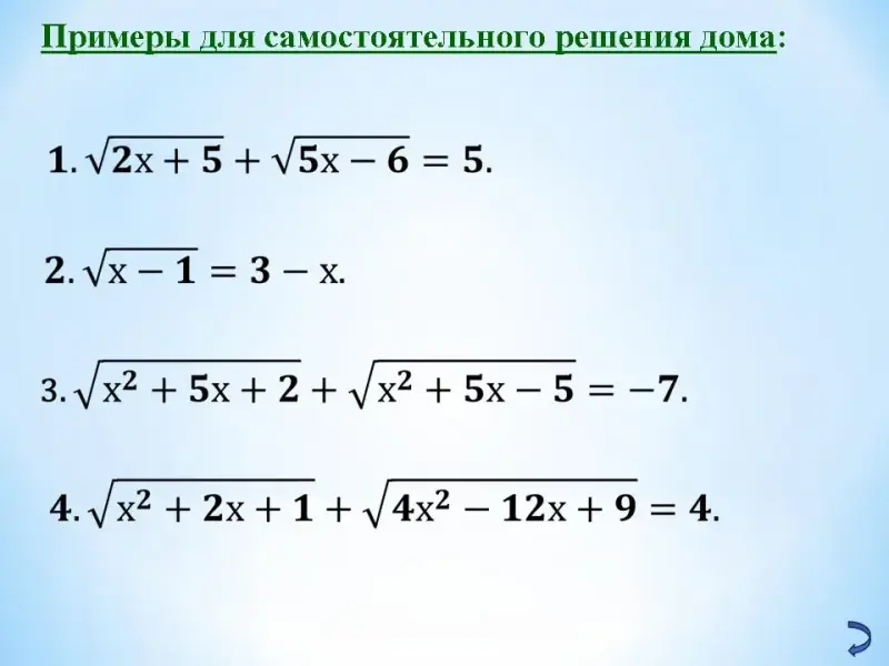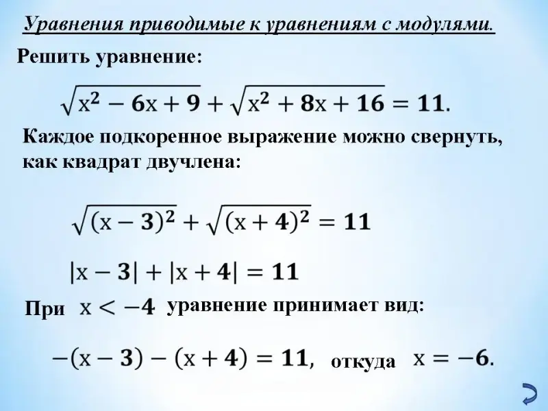 3.4.5. Иррациональные уравнения, приводимые к уравнениям с модулями. (Слайд 31-32)