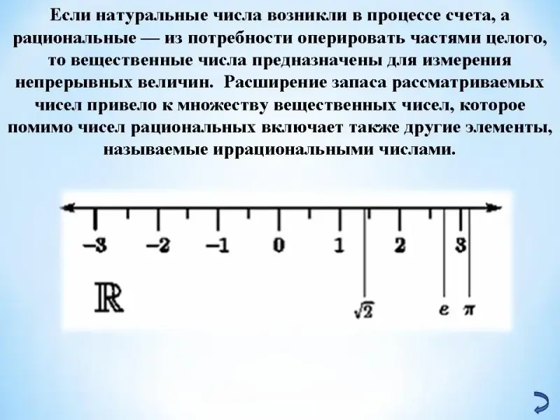 Если натуральные числа возникли в процессе счета, а рациональные - из потребности оперировать частями целого, то вещественные числа предназначены для измерения непрерывных величин. Расширение запаса рассматриваемых чисел привело к множеству вещественных чисел, которое помимо чисел рациональных включает также другие элементы, называемые иррациональными числами.