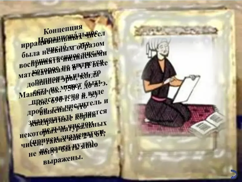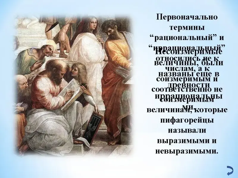 Вначале давайте немного поговорим об иррациональных числах, о том кто стоял у истоков появления иррациональных чисел. (Слайды 37- 48)