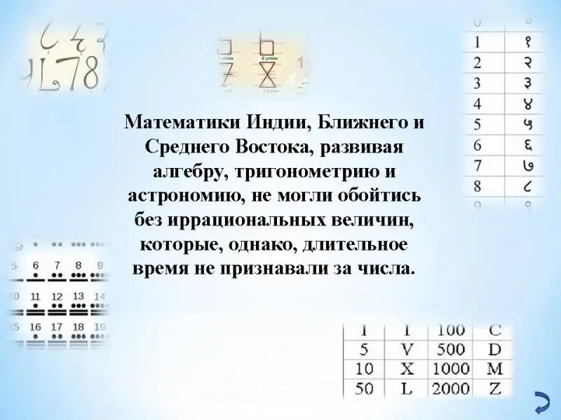 Математики Индии, Ближнего и Среднего Востока, развивая алгебру, тригонометрию и астрономию, не могли обойтись без иррациональных величин, которые, однако, длительное время не признавали за числа.