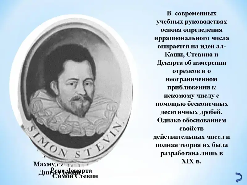 В современных учебных руководствах основа определения иррационального числа опирается на идеи ал-Каши, Стевина и Декарта об измерении отрезков и о неограниченном приближении к искомому числу с помощью бесконечных десятичных дробей. Однако обоснованием свойств действительных чисел и полная теория их была разработана лишь в XIX в.