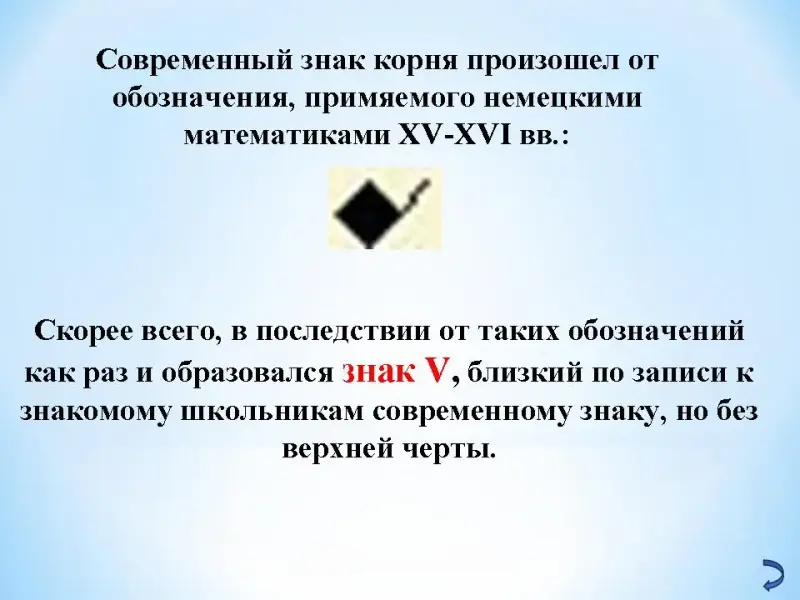 Современный знак корня произошел от обозначения, примяемого немецкими математиками XV-XVI вв.: