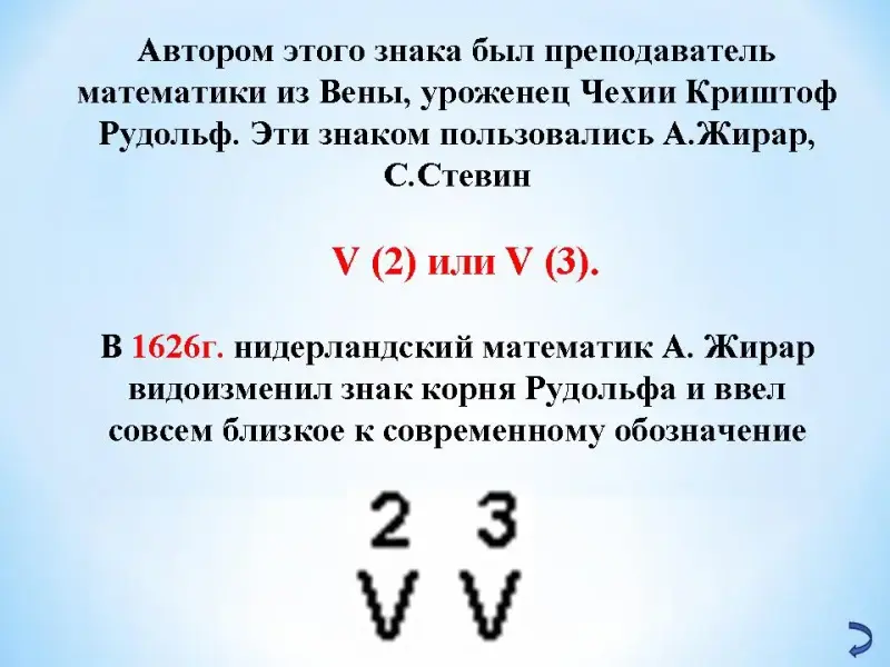 В 1626 г. нидерландский математик А.Жирар видоизменил знак корня Рудольфа и ввел совсем близкое к современному обозначение.
