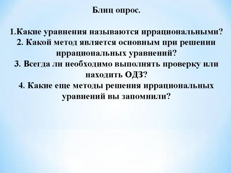 - Какие еще методы решения иррациональных уравнений вы запомнили?