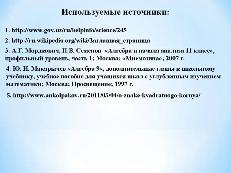 4. Ю. Н. Макарычев "Алгебра 9" , дополнительные главы к школьному учебнику, учебное пособие для учащихся школ с углубленным изучением математики; Москва; Просвещение; 1997 г.