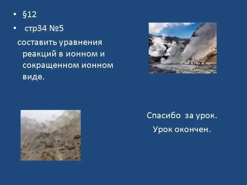 Домашнее задание. §12 стр34 №5 и составить уравнения реакций в ионном и сокращенном ионном виде.