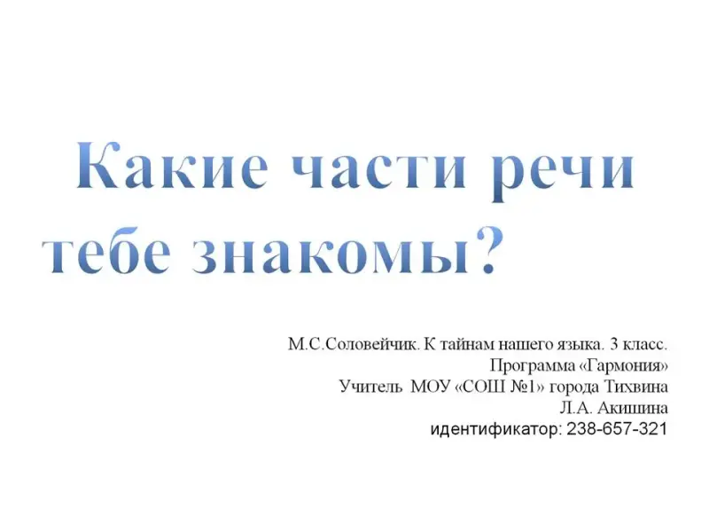 Учащиеся инсценируют стихотворение П. Чеснокова "О чем поспорили части речи?" (в сокращенном варианте) - О чем поспорили части речи? - Сегодня на уроке мы будем говорить о частях речи. Слайд №2-4 |
