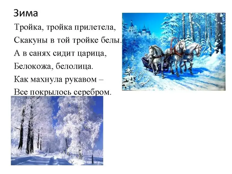 - О какой тройке говорится в стихотворении? - Что за царица сидит в санях? Найдите в стихотворении олицетворение - Назовите глаголы, имена существительные. - Сегодня для урока я подобрала пословицы о зиме. Возьмите конверт №2 и составьте пословицы. Проверка. - Прочитай пословицы, объясни смысл. - Потренируемся в определении частей речи. 2. Практичесая работа по разбору частей речи - Русская зима воспета в народных песнях, в музыке русских композиторов. На полотнах живописцев изображены картины родной природы, зимние пейзажи. Зиме посвящается много рассказов, стихотворений. Мы любим зиму. Нигде в мире нет такой зимы, как у нас, в России. В песнях, былинах, сказках зима названа волшебницей, чародейкой, а мороз - всемогущим, воеводой. - Прочитайте стихотворение. Как вы думаете, кто написал его? Стихи о зиме. Идет волшебница-зима,