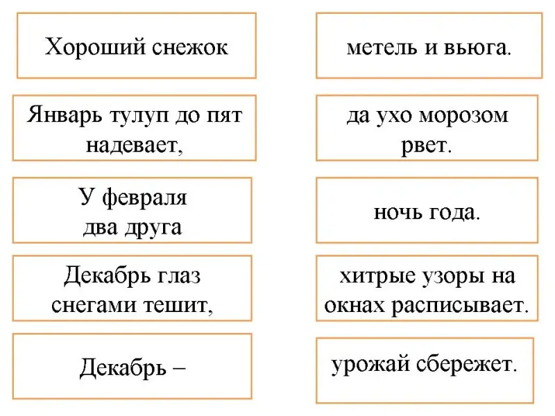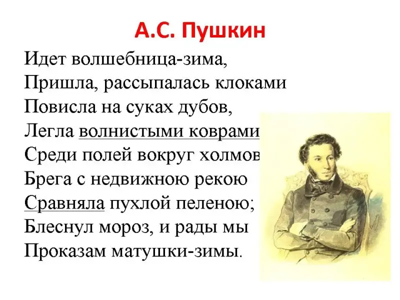 Слайд №6 Зима Олицетворение - наделение неодушевлённых предметов признаками и свойствами человека. Олицетворение. Месяцы названы скакунами, зима - царицей. Пословицы: Слайд №7 Хороший снежок урожай сбережет. Январь тулуп до пят надевает, хитрые узоры на окнах расписывает. У февраля два друга - метель и вьюга. Декабрь глаз снегами тешит, да ухо морозом рвет. Декабрь - ночь года. - Дети объясняют смысл пословиц. Доска. (На интерактивной доске соединяют левую часть пословицы с правой) - Каждая группа получает задание: найдите в пословицах свою часть речи 1 группа: имена существительные 2 группа: имена прилагательные 3 группа: глаголы 4 группа: числительные 5 группа: служебные части речи. (Учащиеся выбирают части речи и прикрепляют их на доске.) Слайд №8 Пушкин А.С. Коврами - существительное, ковёр, мужской род, творительный падеж, множественное число. Волнистыми - прилагательное, волнистый, в творительном падеже, во множественном числе. Сравняла - глагол, сравнять, прошедшее время, единственное число, женский род. Слайд №10 |