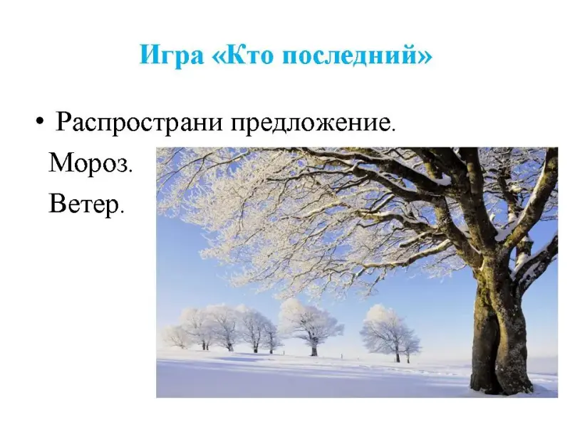 Например: Мороз. Стоял мороз. Стоял сильный мороз. Ветер Дует ветер. Дует сильный ветер. Зимой дует сильный ветер. Зимой дует сильный промозглый ветер. Дети записывают. Тот ученик, который назовет последнее слово, получает право работать у доски с заданием. |