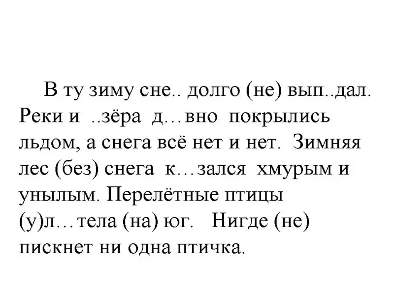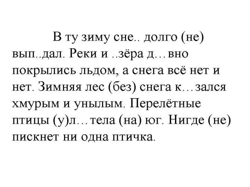В ту зиму сне.. долго (не) вып..дал. Реки и ..зёра д…вно покрылись льдом, а снега всё нет и нет. Зимняя лес (без) снега к…зался хмурым и унылым. Перелётные птицы (у)л…тела (на) юг. Нигде (не) пискнет ни одна птичка. Проверка. |