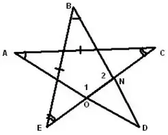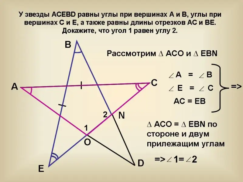 Устная задача 2. (Слайд 12). У звезды ACEBD равны углы при вершинах A и B, углы при вершинах C и E, а также равны длины отрезков AC и BE. Докажите, что угол 1 равен углу 2.