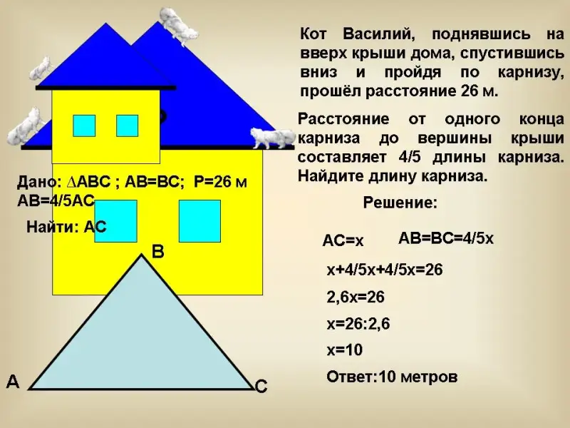 Кот Василий, поднявшись на вверх крыши дома, спустившись вниз и пройдя по карнизу прошёл расстояние 26 м. Расстояние от одного конца карниза до вершины крыши составляет 4/5 длины карниза. Найдите длину карниза.