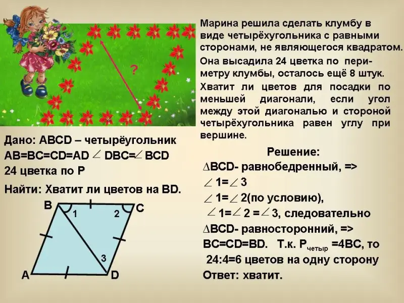 Марина решила сделать клумбу в виде четырёхугольника с равными сторонами, не являющегося квадратом. Она высадила 24 цветка по пери метру клумбы, осталось ещё 8 штук. Хватит ли цветов для посадки по меньшей диагонали, если угол между этой диагональю и стороной четырёхугольника равен углу при вершине.
