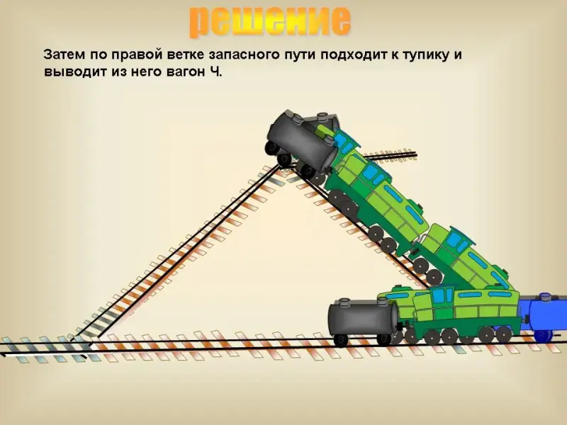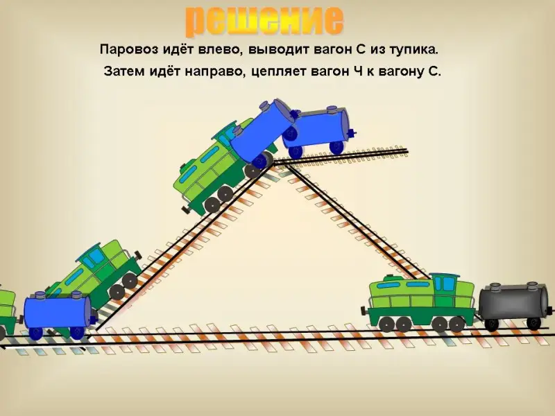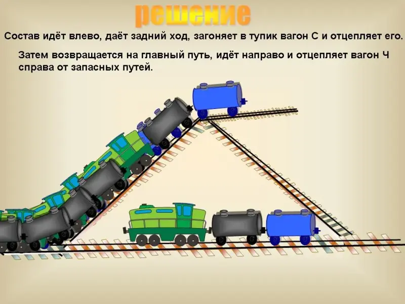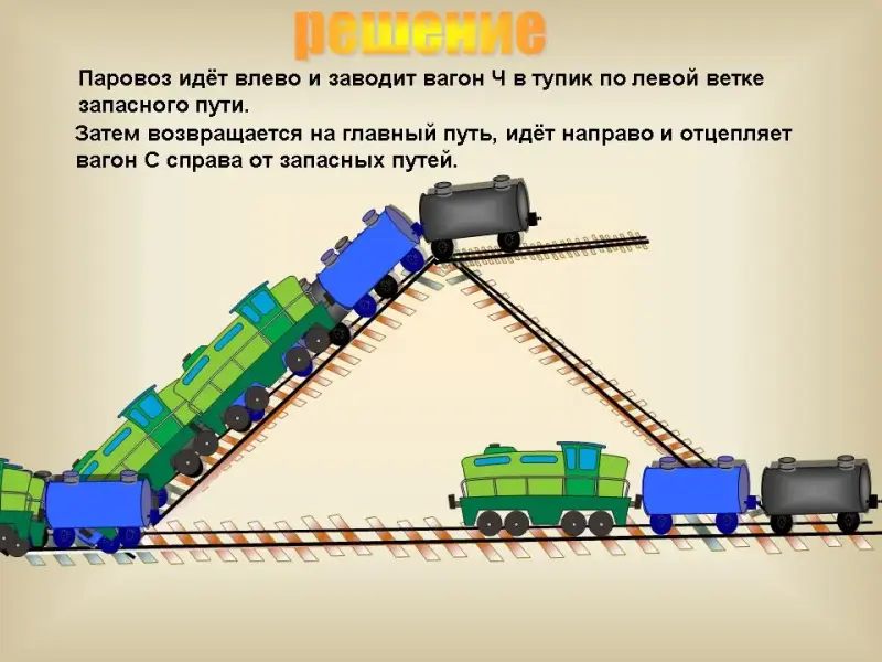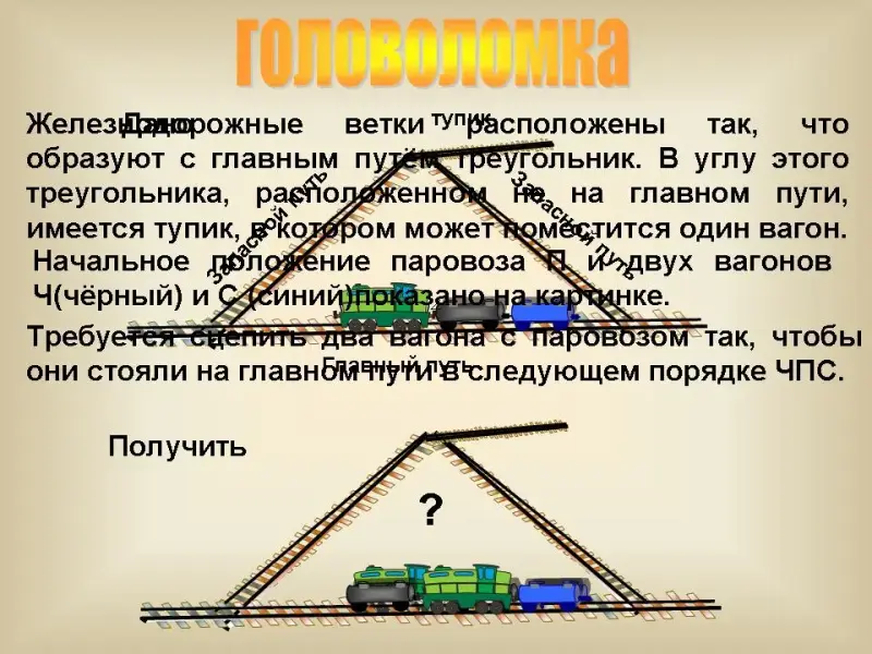 Железнодорожные ветки расположены так, что образуют с главным путём треугольник. В углу этого треугольника, расположенном не на главном пути, имеется тупик, в котором может поместится один вагон. Начальное положение паровоза П и двух вагонов Ч (чёрный) и С (синий) показано на картинке. Требуется сцепить два вагона с паровозом так, чтобы они стояли на главном пути в следующем порядке ЧПС.