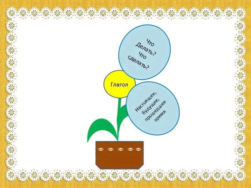 - Кто-нибудь догадался, как называется посаженный нами цветок? Верно, глагол (слайд 5). Но что это? Наш волшебный цветочек не хочет распускаться. Как вы думаете, что нужно сделать, чтобы он зацвел?