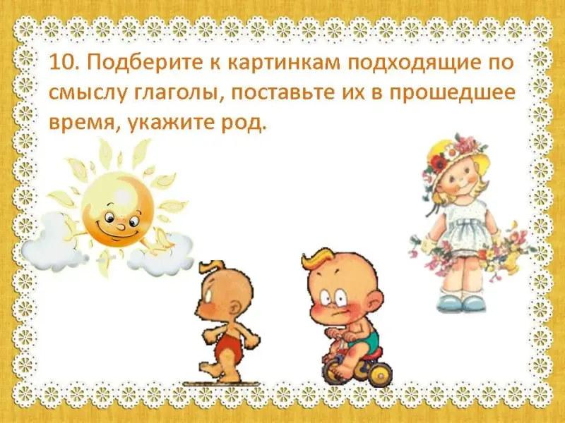 - А сейчас посмотрите внимательно на доску и подберите к картинкам подходящие по смыслу глаголы, поставьте их в прошедшее время, укажите род. (Слайд 20)