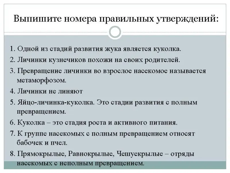 Слайд 21, 22 - Мы изучили типы развития насекомых. Давайте вернемся к вопросам, которые мы поставили перед собой в начале урока и ответим на них.