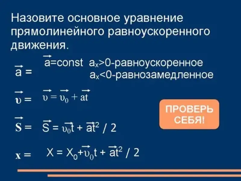 5 слайд - Назовите основное уравнение прямолинейного равноускоренного движения.