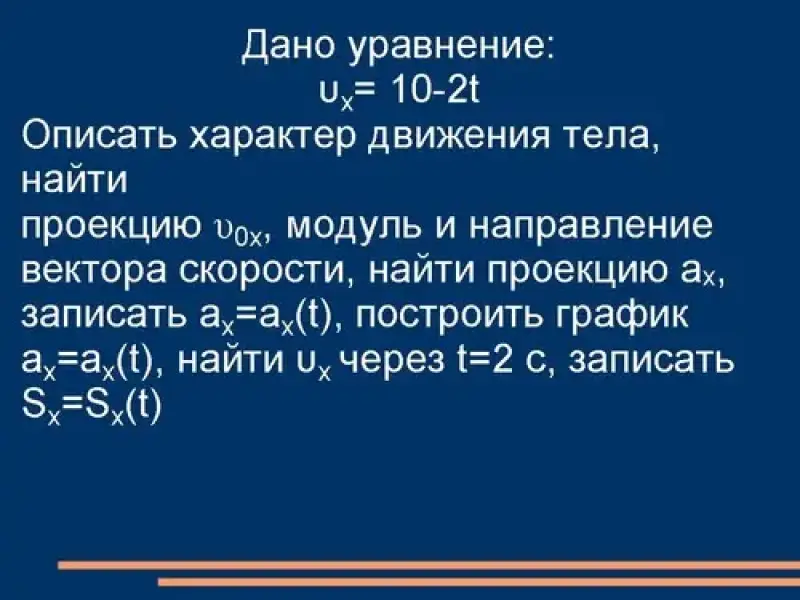 Описать характер движения тела, найти проекцию v0x, модуль и направление вектора скорости, найти проекцию ax, записать ax=ax(t), построить график ax=ax(t), найти vx через t=2 c, записать Sx=Sx(t)
