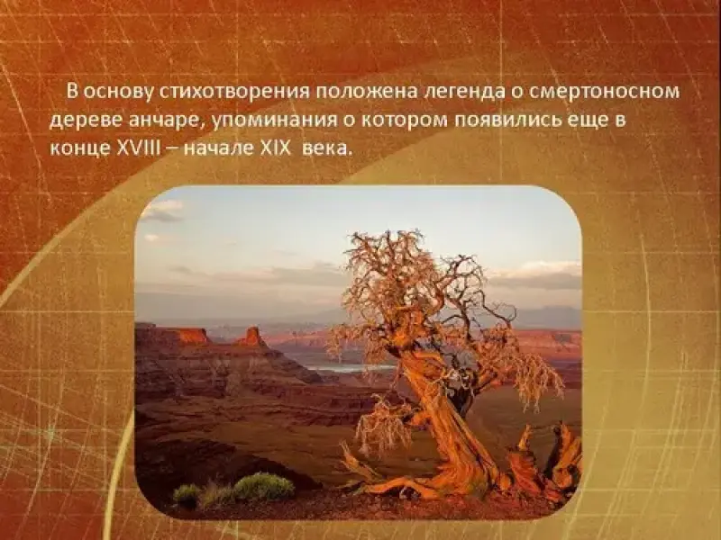 (5 слайд) В основу произведения положена легенда о смертоносном дереве анчаре, упоминания о котором появились еще в конце XVIII - начале XIX века. В ряде публикаций тех лет рассказывалось о том, что ядом анчара на востоке мажут оружие, рискуя жизнью при добывании этого яда. Легенда получила распространение в России. Незадолго до Пушкина известный поэт того времени П. Катенин написал поэму "Сожаление", в котором был нарисован образ "древа жизни", символизировавший "милосердие царево". Исследователи творчества Пушкина выдвигают версию о том, что поэт создал свое стихотворение о "древе смерти" как антитезу катенинскому образу.